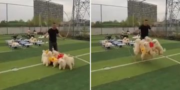 But not wanting to face a potential fight, the little grey and white spotted feline decides to jump over the grey cat’s head and just escape with a giant leap.