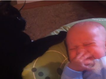 In the video, baby Connar begins wailing and writhing around. However, his brother, pet cat Stewie manages to control the situation by gently stroking him...