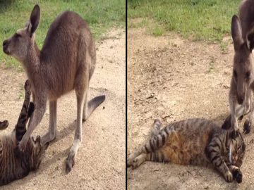 Kangaroo and cat playing You don’t often see cats and kangaroos bouncing around together. Ah, but in Australia, this could happen. The little pet ‘roo...
