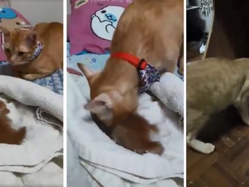 This father cat might not have the best parenting skills but he tries his best to take care of his kitten including feeding it well....