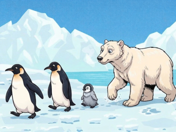 A charming cartoon illustration is shared in the picture above, where a family of King penguins and a polar bear are walking together on a...