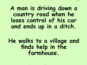 A man is driving down a country road when he loses control of his car and ends up in a ditch. He walks to a...