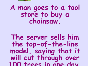 A man goes to a tool store to buy a chainsaw. The server sells him the top-of-the-line model, saying that it will cut through over...