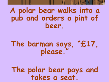 A polar bear walks into a pub and orders a pint of beer. The barman says, “£17, please.” The polar bear pays and takes a...