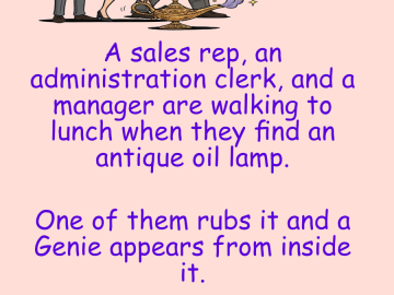 A sales rep, an administration clerk, and a manager are walking to lunch when they find an antique oil lamp. One of them rubs it...