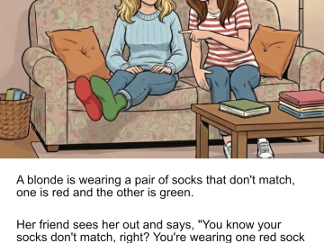 A blonde is wearing a pair of socks that don’t match, one is red and the other is green. Her friend sees her out and...
