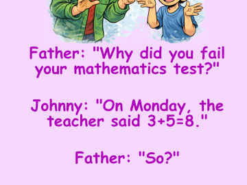 Father: “Why did you fail your mathematics test?” Johnny: “On Monday, the teacher said 3+5=8.” Father: “So?” Johnny: “On Tuesday, she said 4+4=8 And on...